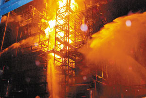 消防隊員在奮勇滅火(李棟、孫江敏、陳德鵬攝)。