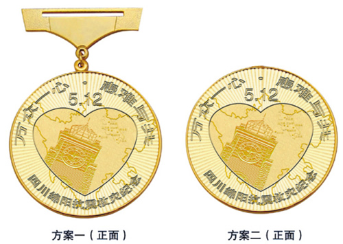 趙琛說,紀(jì)念章有著特殊的表現(xiàn)形式。內(nèi)輪廓為心型,代表全國人民萬眾一心支持綿陽賑災(zāi);外輪廓為圓形,象征太陽。整個(gè)紀(jì)念章的正面寓意為“心中太陽升起”,表達(dá)四川綿陽人民重建家園的信心和力量。