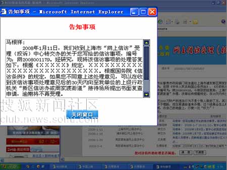 本報(bào)記者隨即與馬先生取得聯(lián)系,他當(dāng)著記者的面,用記者的電腦打開了在 “中國(guó)·上!闭W(wǎng)站上的信箱。記者看到信箱內(nèi)有自去年至今的來(lái)往信件,這些信件均反映周家渡街道侵占東明家園公建配套設(shè)施事宜。記者點(diǎn)擊了今年5月4日收到的標(biāo)題為 “周家渡街道網(wǎng)上信訪中心處理答復(fù) ‘馬根祥2008年1月11日……’”標(biāo)題的回復(fù)信件,在彈出的窗口中,被馬先生稱為 “史上最!毙姓貜(fù)隨即呈現(xiàn)在記者眼前: