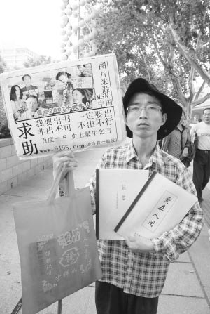 手舉一個(gè)“要飯”的牌子和兩本書(shū)稿,口袋里裝著一把自制的名片。昨日上午,在漢口中山公園大門(mén)附近,一位被網(wǎng)友稱為“史上最牛乞丐”的男子現(xiàn)身街頭,圍觀群眾對(duì)其行為褒貶不一。