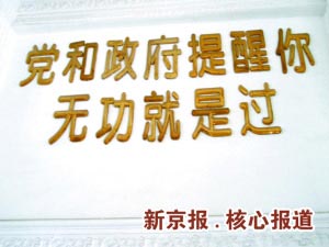 在潁泉區(qū)政府辦公樓大堂里貼著的宣傳口號(hào)。 記者 黃玉浩 攝