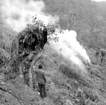 從西雙版納景洪市往景訥鄉(xiāng)走,一路上看到的全是光禿禿的山頭,樹木橫七豎八地倒在一旁,還冒著滾滾濃煙!敖鼛啄暌驗橄鹉z價格飛漲,整個西雙版納開始大規(guī)模毀林種膠。樹木砍倒后運不出去,就只有放火燒掉,同時還能做橡膠林肥料,我們這里又回到了‘刀耕火種’的原始社會了!笨蛙囁緳C(jī)說。