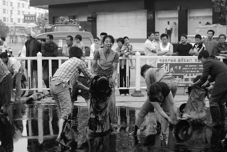 吊車(chē)作業(yè)的過(guò)程中,就有部分人準(zhǔn)備好簸箕、臉盆等工具,要搶泄漏在地面上的原油。7時(shí)許,見(jiàn)仍沒(méi)有專(zhuān)門(mén)的清理人員前來(lái)清理路面上的原油,部分人開(kāi)始哄搶原油,他們先是五六個(gè)人一組站成一圈,圈定自己的地盤(pán),接著用衣服、簸箕、臉盆等工具收集路面上的原油,然后迅速裝入編織袋內(nèi)。