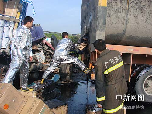 意外發(fā)生在2日上午,一輛80噸瀝青槽罐車(事后核實(shí)載有59噸)北行至京珠高速公路廣東韶關(guān)曲江服務(wù)區(qū)內(nèi)路段時(shí),被一輛大貨車追尾碰撞。槽罐車車尾受到嚴(yán)重的撞擊后,罐內(nèi)的瀝青不斷向外泄漏。