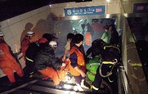 消防在清除地鐵5號線崇文門站的積水。
