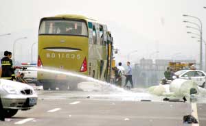 昨天下午4時(shí),記者趕到事發(fā)現(xiàn)場,看到大巴車停在第二車道,車子后部地下有兩三個(gè)破裂的白色油桶,地上淌著許多綠色液體,還在冒著縷縷青煙。大巴兩側(cè)車窗已經(jīng)破碎,車頭的擋風(fēng)玻璃也已破裂呈蜘蛛網(wǎng)狀掛在車頭,車下有火燒過的黑色痕跡。