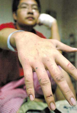 “車子被撞后,司機(jī)馬上停車打開車門,我們都往下跑,車?yán)镌诿盁,車身外還起了火,坐在中后部來不及跑下車的學(xué)生抽出隨車鐵錘擊碎玻璃,從車窗內(nèi)跳下逃生。”番禺區(qū)人民醫(yī)院內(nèi),一位姓杜的華農(nóng)學(xué)生躺在骨科病床上向記者描述。
