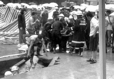 昨天上午9時50分,鄭州市區(qū)下著雨。郭先生沿敦睦路人行道向北走著,前面是一中年男子和一年輕女子!奥犚娹Z隆一聲響,我前面走的倆人沒影兒了,倆人掉進大坑了!倍啬缆分苓呌卸嗉掖笮头b商場,平日行人如織。