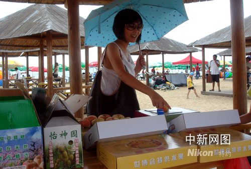 中新網(wǎng)上海八月七日電 (萬(wàn)軍)見過(guò)穿著比基尼的時(shí)尚男女沙灘上品蟠桃的逍遙情景嗎?這幾天里,在上海金山城市沙灘上,鼎鼎大名的“皇母”蟠桃成為沙灘男女的新寵,這種上海市面上也難得一見的世博會(huì)特供“蟠桃仙果”,這次與扎堆沙灘的時(shí)尚男女來(lái)了一次親密接觸。