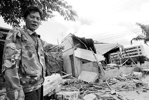 摩托車修理店被歹徒用推土機(jī)推成廢墟。記者古月攝