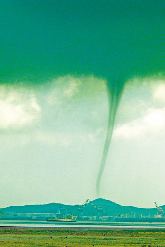 “太壯觀了!龍卷風(fēng)在海面上吸起500多米高的水柱,一時(shí)間水柱和天上的烏云連接在一起!钡谝淮慰吹健褒埼逼嬗^的虞先生在電話中依然顯得特別興奮。昨天上午10時(shí)20分左右,在定海區(qū)馬岙鎮(zhèn)上班的虞先生,遠(yuǎn)遠(yuǎn)看到岱山縣秀山常石集團(tuán)附近有一片烏云。不一會(huì)兒,烏云中忽然伸出一條黑色水柱,直指海面。隨后,水柱越來越粗,并且略微移動(dòng)。當(dāng)時(shí)他意識(shí)到,這應(yīng)該是龍卷風(fēng)了,也就是傳說中的“龍吸水”!整個(gè)過程大概持續(xù)了10分鐘不到,之后烏云就散去了。