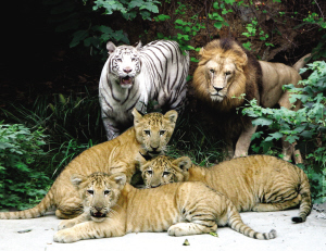 據(jù)了解,獅虎獸的父母是一只雄性非洲獅和雌性孟加拉白虎“小雪”,都是2002年在紅山動物園出生的,一起生活在“獅虎生態(tài)園”,感情很好。當(dāng)初跟它們一起關(guān)進(jìn)園里的還有另外五只猛獸,包括兩只母獅,一公一母兩只虎,以及一只母白虎?墒沁@只雄性非洲獅就是喜歡跟“小雪”待在一起,對自己的同類——兩只母非洲獅反倒不理不睬。后來,工作人員先后移出了兩獅兩虎,園里只留下“小雪”、雄性非洲獅,和一只母東北虎。園子里“太平”了,“小雪”跟它的獅“哥”更是形影不離,親密不已,那只母東北虎成了“電燈泡”。