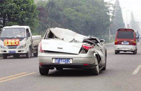 小主人回憶當(dāng)時的情景,在電話里笑著說:“我沒想到它還能動,轟油、剎車都沒問題。”小主人上車沒系安全帶,它還一直在報警提示著主人呢。小主人有8年駕齡,靠著經(jīng)驗,它慢慢起步了,由于右后輪完全變形,小跑起來有點跛,但跑起來后還比較穩(wěn)定。小主人將音響打開,它還能唱歌。就這樣,15公里的路程,從漢旺到綿竹修理廠,頑強(qiáng)的它引來無數(shù)人的眼光。它哼著歌,以30-40公里的時速,搖搖晃晃地到達(dá)了目的地。