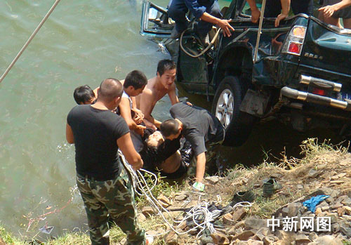 此時(shí)距離事發(fā)時(shí)間已經(jīng)過去了半個(gè)多小時(shí),被困人員的生還幾率十分渺茫。消防人員通過現(xiàn)場(chǎng)偵察得知,小車在行使過程中被撞,由右邊沖過路基墜入落差6米的水庫中。11時(shí)30分,消防戰(zhàn)士下水進(jìn)行搜救。同時(shí),消防部門也調(diào)動(dòng)大型吊車及牽引車到現(xiàn)場(chǎng)參與救援,利用吊車吊鉤實(shí)施起吊營救。