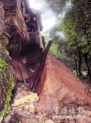 前天凌晨,南岸區(qū)涂山鎮(zhèn)石溪路,一山頂民房地基的石質(zhì)基床“咔哧咔哧”一分為二,分離的巨石隨著巖邊堡坎坍塌,并懸在山腰。山上民房屋基懸空,儼然空中樓閣,而山腰巨石則虎視眈眈,威脅著下方11戶人家。