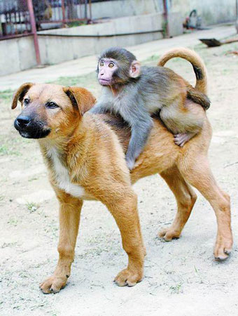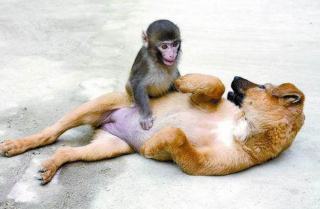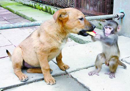 昨天(5日)上午,記者在駐馬店市南海公園動物園看到,一只6個(gè)月大的雌性小狗與年齡比自己小一個(gè)月的雄性猴崽愉快地在一起玩耍。