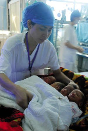盡管孩子的父親失蹤,孩子們在醫(yī)院得到很好的照顧。記者采訪時看到四胞胎躺在嬰兒溫箱里睡得很香。醫(yī)務人員告訴記者,四胞胎屬于早產(chǎn)兒,住院前四胞胎中的男嬰肺部出了點問題,吸過幾天氧,現(xiàn)在情況已基本穩(wěn)定,另外三名女嬰的健康狀況都比較好。