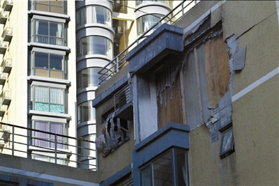 去年8月19日星期天,上午8點40分左右,三環(huán)新城小區(qū)居民安先生和妻子正在去早市的路上。當(dāng)他們經(jīng)過7號院6號樓時,頭上突然傳來一聲巨響,他下意識地拉著妻子往前跑。幾秒鐘后,路面已被碎玻璃和墻皮磚塊等覆蓋,還有一個沙發(fā)從天而降橫在路上。