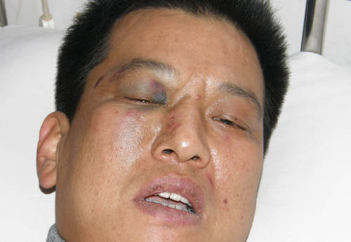據(jù)他回憶說,12月15日下午,我在杜康花園小區(qū)尚要武家等車去灌液化氣,大約4點鐘左右,一伙不明身份的人(后獲悉是該縣刑警)闖進家中,一人摟著我脖子用手槍指著我頭不讓動,將我摔在地上,另一人將我皮帶抽掉,又把鞋子脫掉,對我搜身,將電話拿走,我說我沒辦違法事,控制我的人用手槍在我頭上砸了兩下說:“不準說話,不許動!贝巳擞孟ドw頂著我脖子,我呼吸困難,我說我出不來氣,掙扎了一下,此人用槍在我頭上砸了一下,又有一人在我胸口跺了兩腳,走到我左側(cè)朝我面部、頭上猛跺,隨后將我背銬手銬塞上車(非警車)。