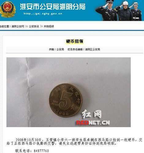 這則5毛錢招領(lǐng)告示系江蘇省淮安市淮陰公安分局所發(fā)。啟示稱,“王營(yíng)鎮(zhèn)小學(xué)六一班學(xué)生蔡卓樾在西馬路口撿到一枚硬幣,交給了正在西馬路口執(zhí)勤的交警,請(qǐng)失主迅速帶身份證件到我局領(lǐng)取”。啟示上還附有照片,一枚銹跡斑斑的5毛錢硬幣,靜靜躺在照片里。據(jù)悉,這是他們根據(jù)上級(jí)的要求,作為政府信息公開的具體實(shí)施步驟,通過(guò)互聯(lián)網(wǎng)發(fā)布失物招領(lǐng)信息。記者搜索到5毛錢硬幣頁(yè)面已被刪除。不過(guò),能通過(guò)“快照”看到。