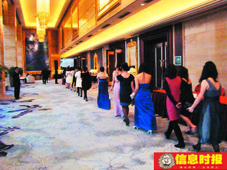 1月10日晚,備受關(guān)注的廣州史上最昂貴的“世紀(jì)佳緣.名仕之約”相親會(huì),終于揭開(kāi)了神秘的面紗,在廣州一家五星大酒店里,從6000多名報(bào)名者中脫穎而出的40名美女,嚴(yán)冬之下穿著單薄、靚麗的晚禮服,邁著貓步,擺出媚態(tài),供30名鉆石王老五們鑒賞。[1月11日[[信息時(shí)報(bào)]]]