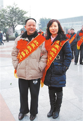 在什邡市政府研究室副主任廖曉軍的相機里,有一張劉慶祿夫妻披著抗震救災(zāi)模范綬帶的照片。廖曉軍說,去年12月30日,市委、市政府召開抗震救災(zāi)表彰大會,辦公室通知劉慶祿參會時,他說自己正在值班,要去幾個受災(zāi)鎮(zhèn)發(fā)放過冬物資,就不參加了。因為他作為模范個人代表不能缺席,于是就一再通知他務(wù)必到會。最后,他來不及回家換件衣服,就直接從倉庫趕到大會現(xiàn)場。也在這里,留下了生前最后的影像,也是和妻子的最后合影。