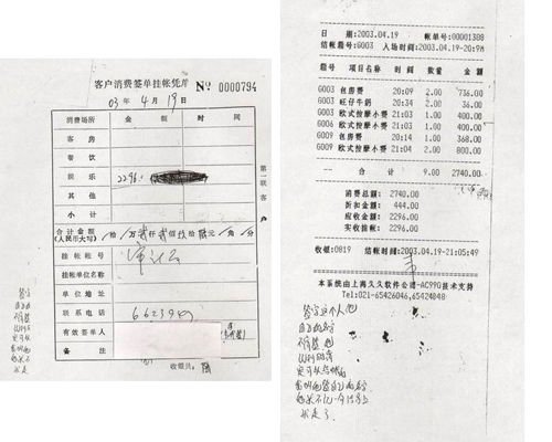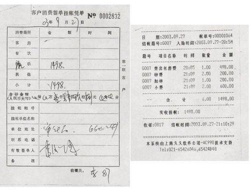 結(jié)賬小票上列明的服務(wù)包括貴賓包房費、鐘費、加鐘、小費、飲料等。第一次消費的時間為2003年4月19日,入場時間為晚8點09分,結(jié)賬時間為晚9點05分?傁M金額為2296元。其中,包房共計3間,費用為1104元(368×3);歐式按摩小費共有3筆,其中兩筆分別為400元,另一筆則標(biāo)明數(shù)量為2,金額為800元。另一份賬單的時間為2003年9月27日,入場時間為晚上8點03分,結(jié)賬時間為晚9點10分?傁M金額為1498元。其中“貴賓包房費”是498元,鐘費是200元,加鐘是200元,小費是600元。