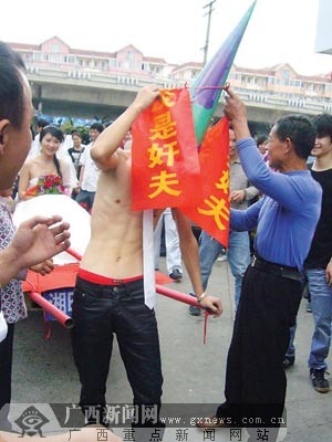 平板車接新娘,新郎畫花臉,這樣的接親方式或許大家已習(xí)以為常,可新郎和新娘身披“我是奸夫”和“我是淫婦”如此扎眼字樣招搖過市的接親方式,您可能還真沒見過。2月16日下午,南寧市街頭便出現(xiàn)了這樣一支頗為搶眼的接親隊(duì)伍。