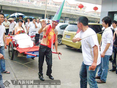 2月16日下午3時(shí)許,記者在南寧市葫蘆鼎大橋上看到了這支接親隊(duì)。走在最前面的新郎手拉一輛“牌照”為“湘E-88888”的平板車,平板車雖顯破爛,卻布置一新,上面還掛著橫幅“我是毛××今天討婆娘”。新郎的頭頂上還戴了一個(gè)錐筒形狀的綠帽,臉則被畫得滑稽非常,脖子上系著一條略顯夸張的白領(lǐng)帶。他上身并未穿衣,只掛著綢緞,上書“我是奸夫”字樣。