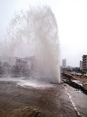 “先是聽到吱吱吱地響,馬上要到10點時,突然‘砰’的一聲后,一股水柱就沖上天了。”60多歲的黃婆婆當(dāng)時在現(xiàn)場,據(jù)她介紹,沖天水柱有人的大腿粗細(xì),“起碼有十多米高!