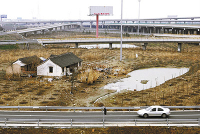 跨過一張已經(jīng)被撕裂的鐵絲網(wǎng),快速奔過兩條雙向六車道的高速公路和往上海方向的匝道,那呼嘯而過的車輛讓我不寒而栗。強(qiáng)壓住內(nèi)心的恐懼,繼續(xù)翻越往杭州方向的匝道,往前三百米,又穿越高架匝道,邁過雜草叢生、凹凸不平的地面,再往里前行二百米后,隱約看見一戶被條條匝道環(huán)繞著的小屋。據(jù)村民介紹,這條“長征路”是唯一能到達(dá)王來英家的“通途”。