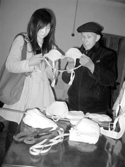 傍晚,大爺在桌子上堆起一大摞成品胸罩,都是樣品。大爺說:“從4寸到8寸的都有,你看這做工!”“我只懂A杯、B杯啊!”說完這話的劉梅,看到大爺一臉茫然。傳統(tǒng)的尺寸和現(xiàn)代的“杯標(biāo)準(zhǔn)”成為老少兩代人的第一道難題!熬褪菑淖钚〉阶畲舐,簡單,下來慢慢換算。”3人和冉大爺?shù)溺蹆合敝艽蠼阋黄鸺?xì)化即將開始的工作。周大姐當(dāng)“打工”,兩個同學(xué)負(fù)責(zé)把信息上傳貼吧并建起一個網(wǎng)店!25-80元一個,純棉面料環(huán)保,手工制作個性,對于一大一小或單邊的客戶更是長項!边@是他們初步的網(wǎng)絡(luò)宣傳詞。