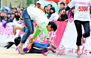 昨天下午,在東莞市新華南MALL就上演了一場(chǎng)別開生面的男生高跟鞋大賽,約400名男子集體穿著高跟鞋賽跑慶祝三八婦女節(jié)。盡管在情侶賽跑環(huán)節(jié)不少情侶都會(huì)驚險(xiǎn)地摔上一跤,不過他們?nèi)孕θ轁M面沖到終點(diǎn),然后再來一個(gè)深情的擁抱。