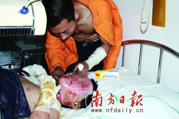 還來不及驚叫,母子倆周身便被大火包圍。離開不到半小時的父親想不到,家中一切已付之一炬。他當(dāng)然來不及多想,立即將衣服正在燃燒的妻子抱到水池邊,接過水直接潑向妻子,之后是9歲的小中林。消防車和救護車很快到來,火勢得到控制,而這一家三口也被送到武警醫(yī)院。