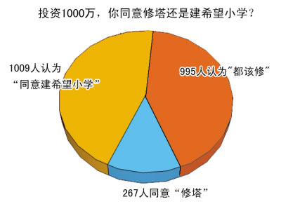 截至昨天下午5時(shí),大渝網(wǎng)發(fā)起的調(diào)查顯示,你認(rèn)為修建第一高塔有必要嗎?2475人參與投票,1154位網(wǎng)友認(rèn)為“沒(méi)必要,又是面子工程”;1091人認(rèn)為“為了導(dǎo)航,也能增添新景觀”。在“投資1000萬(wàn),你同意修塔還是建希望小學(xué)?”的調(diào)查中,網(wǎng)上2271人參與投票,1009人認(rèn)為“同意建希望小學(xué)”;267人同意“修塔”。