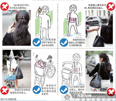逢出門必拿包的女子,很容易成為飛車賊的下手對象。女性外出時,應該如何防止被搶?昨日, 長期在打擊“兩搶”戰(zhàn)線上的南寧市公安局西鄉(xiāng)塘分局刑偵二大隊的民警們,向市民傳授了一些方法。警方通過媒體提醒廣大市民,外出時注意保管好自己隨身攜帶的背包,一旦遭遇飛車搶奪,請在第一時間報警。