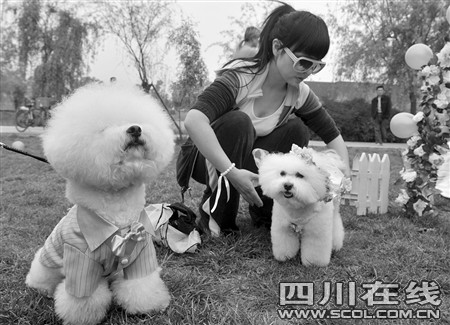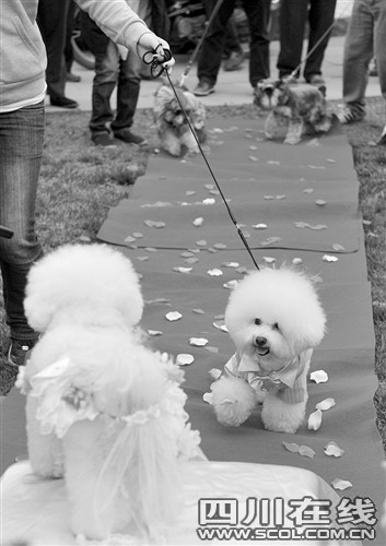 昨天下午3點(diǎn),成都非物質(zhì)文化遺產(chǎn)國家公園內(nèi)響起了結(jié)婚進(jìn)行曲,正當(dāng)市民們駐足想看下新人的模樣時(shí),兩只白色的比熊犬身穿鮮艷禮服走上紅地毯,突然闖進(jìn)大家的視野。原來,它們就是這場婚禮的主角。13套豪華禮服,紅毯花房,“狗友”證婚還有入洞房等等,一樣都不能少。主人請(qǐng)人專門為狗狗策劃、舉行這么隆重的婚禮,數(shù)百在場市民對(duì)此褒貶不一……