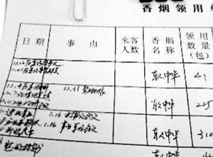 在一份招待用煙流水賬中,從2008年11月至2009年2月期間,招待用煙共用去了5277包,近530條。每個月的招待用煙數(shù)量都超過了1319包,均為中華香煙,有硬盒有軟包,按均價每盒50元算,相當于每月要花銷6.6萬元。記者發(fā)現(xiàn),其中用煙數(shù)量最多的是今年的1月份,共用去2789包中華牌香煙,約為280條。在這份招待用煙的流水賬最下方,則標出了這四個月當中招待用煙數(shù)目出現(xiàn)了超支,多用了1934包。
