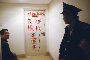 4月3日中午,東三環(huán)華騰園9號(hào)樓17層的居民張女士走出家門后,迎面看到鄰居門上的幾個(gè)紅色大字:“欠債還錢 還!還!還!”