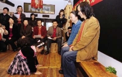 曾先生(市民):我認(rèn)為這是一種文化的回歸,一種民族自我的回歸。行跪拜之禮,不在于形,但可以通過形式對(duì)中國古代經(jīng)典文化進(jìn)行繼承。這種跪拜之禮,有人可能會(huì)說它是糟粕,但是,是否糟粕,誰來定論?為什么跪拜之禮就是糟粕?現(xiàn)在好多地方過年時(shí),晚輩給長輩拜年也是跪著的呢。