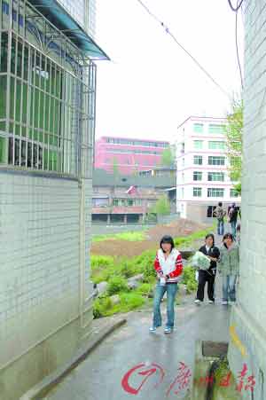遠(yuǎn)處紅色建筑是玉淮中學(xué),附近租房住的學(xué)生們每天都要經(jīng)過(guò)狹窄的通道,道路泥濘。
