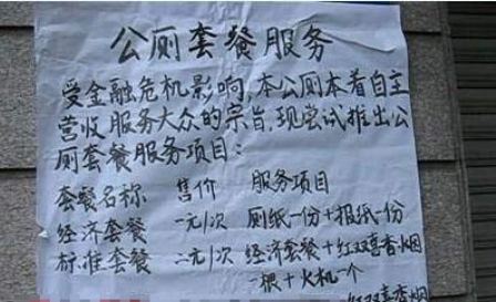 據(jù)悉,告示上將該項(xiàng)服務(wù)分為五個(gè)等級(jí),分別是經(jīng)濟(jì)套餐、標(biāo)準(zhǔn)套餐、商務(wù)套餐、豪華套餐、總統(tǒng)套餐。每個(gè)套餐還列出了各自的服務(wù)項(xiàng)目。例如經(jīng)濟(jì)套餐就贈(zèng)送廁紙一份、報(bào)紙一份,收費(fèi)也相當(dāng)?shù)土瑑H僅需要一元;2元的標(biāo)準(zhǔn)套餐則在經(jīng)濟(jì)套餐的基礎(chǔ)上送出紅雙喜香煙一根火機(jī)一個(gè)。最雷人的應(yīng)該算是價(jià)值10元的豪華套餐,竟然有專業(yè)陪聊的服務(wù)項(xiàng)目。而20元的總統(tǒng)套餐也讓人摸不著頭腦,居然包括彩票一張和精美紀(jì)念冊(cè)。這些都讓網(wǎng)友們好奇不已:不知道當(dāng)你如廁的時(shí)候,有人在一旁陪你談心,會(huì)是什么樣的感受?而精美紀(jì)念冊(cè)的內(nèi)容,又會(huì)是什么?