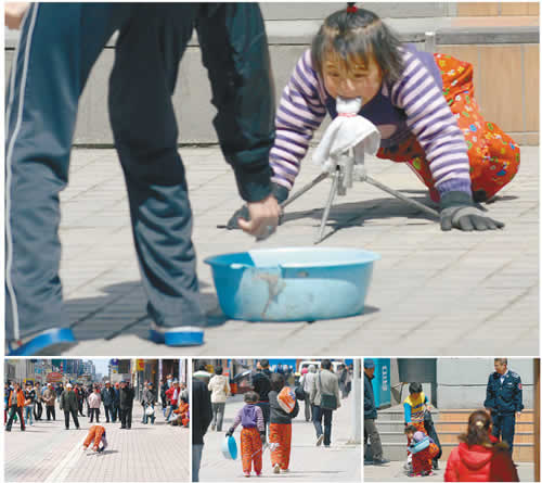 只見(jiàn)五六歲的小女孩熟練地做著高難度的彎腰動(dòng)作,而一旁稍大些的小男孩則很職業(yè)地觀望著周圍的動(dòng)靜(后來(lái)記者了解到他原來(lái)是在觀察是否有管理者到來(lái),因?yàn)檫@里是不讓擺攤賣藝的),同時(shí)掃上一兩眼路人施舍的錢幣是多少。