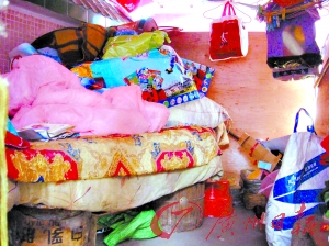 小窩棚里面有一個破舊的床墊,用木桶、磚塊等胡亂墊高。又臟又潮濕的被子等日常生活用品和阿婆撿回來的一些廢品雜亂地堆放在床上和底下,散發(fā)著一股難聞的氣味。