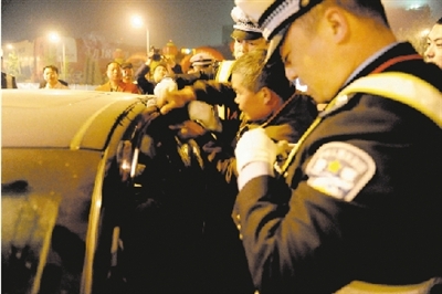 17日22時(shí)30分,記者趕到桐柏路與隴海路口東北角,只見(jiàn)一輛轎車停在路口,交警二大隊(duì)一中隊(duì)指導(dǎo)員潘亞文帶著8名民警,還有市交警八大隊(duì)6名民警,圍著這輛轎車,不停向車窗內(nèi)的司機(jī)示意讓他開門。記者看到車內(nèi)共有3人,戴著眼鏡的司機(jī)伏在方向盤上,任窗外民警怎么叫都毫無(wú)反應(yīng)。此時(shí),一輛警務(wù)拖車也趕到現(xiàn)場(chǎng),因?yàn)榕峦宪嚂r(shí)車內(nèi)乘客跳車受傷,所以,警方?jīng)]有動(dòng)用拖車。潘亞文介紹,當(dāng)夜是統(tǒng)一對(duì)全市酒后駕駛機(jī)動(dòng)車大檢查,大約21時(shí)40分,他們?cè)诖寺房诎l(fā)現(xiàn)這輛車行駛隨意變更車道,就示意車停下檢查。“車停下后,我示意司機(jī)出示駕照,司機(jī)把駕照交給我,我同時(shí)聞到他身上酒氣很濃,就拿出酒精測(cè)試儀讓他吹,沒(méi)想到司機(jī)突然關(guān)了車門,我們喊了他們一個(gè)小時(shí)了,他們就是不出來(lái)。”潘指導(dǎo)員把這名司機(jī)的駕照出示給記者,照上寫著“方志剛,二七隴海中路36號(hào)”字樣。
