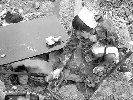 廢墟里,一個(gè)少年被扭曲的鋼筋、預(yù)制板埋著,眼神里流露出對(duì)生的渴望;廢墟外,一名穿涼鞋的女護(hù)士,左手提著一袋血漿,右手和少年的左手緊緊握在一起。地震中,這張照片被網(wǎng)友們稱(chēng)為“汶川大地震中最感人的十大鏡頭”,照片中的女護(hù)士顧云仙,被網(wǎng)友們稱(chēng)為“最美女護(hù)士”。