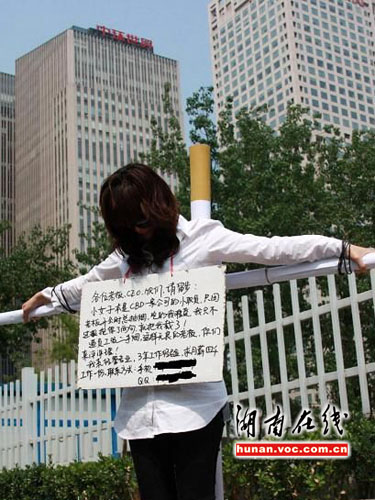 “為了找工作,真是無所不用!”日前,網(wǎng)友在華聲論壇發(fā)帖,稱在當?shù)氐囊粐Q(mào)大廈CBD辦事時,看見一年輕女子背著一個巨型十字架,雙手展開綁在十字架上,而她這樣做只為“求得一份工作”。