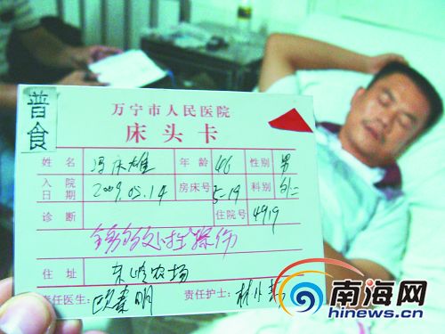 5月20日下午,記者在萬(wàn)寧市人民醫(yī)院住院部見(jiàn)到了被打的收膠工馮慶雄,他正躺在病床上,表情看起來(lái)痛苦,不時(shí)用手撐在后腰撫摸腰間。據(jù)他的主治醫(yī)生介紹,經(jīng)診斷馮的傷情為:頭、胸、腰等身體多個(gè)部位軟組織挫傷,經(jīng)B超檢查發(fā)現(xiàn),其右腎下極挫傷。