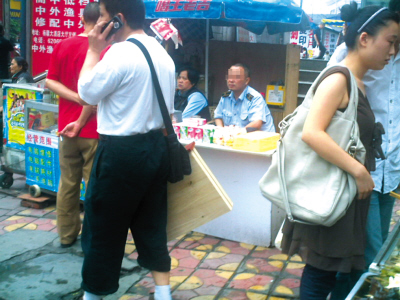 6月13日,網(wǎng)友“透明”在大渝網(wǎng)發(fā)帖稱,當(dāng)日他前往楊家坪辦事,看到一個(gè)光頭城管正在幫一個(gè)小販看攤,詫異之余用手機(jī)拍下了這一幕。記者從照片中看到,在人行道上,一個(gè)由一把太陽(yáng)傘和一個(gè)玻璃柜臺(tái)組成的雜貨攤后面,該城管正悠閑地坐著,似乎很享受守?cái)偟母杏X(jué)。