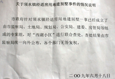 在落款時間為2009年6月18日的“關(guān)于須水鎮(zhèn)經(jīng)適房用地建別墅事件的情況說明”中顯示:“市政府針對須水鎮(zhèn)經(jīng)適房用地建別墅一事已經(jīng)成立了由市監(jiān)察局、土地局、規(guī)劃局、公安局、建委、房管局等組成的專案組,對“西湖小區(qū)”進(jìn)行聯(lián)合查處。查處結(jié)果由市監(jiān)察局統(tǒng)一向外公布,各個部門無答復(fù)權(quán)!